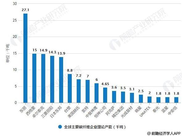 2017年,日本东丽、德国西格里、美国卓尔泰克(已被东丽收购)、三菱丽阳、日本东邦五家企业合计产能8.52万吨,占全球总产能的58%。其中,日本东丽公司仍是全球碳纤维生产第一大公司,2017年产能达到2.71万吨。
