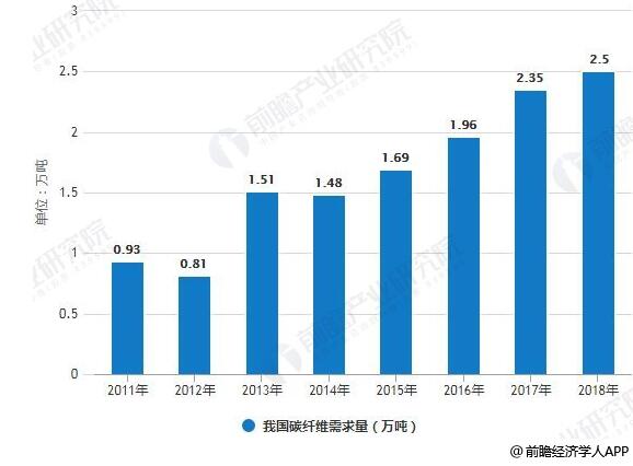 近年来,我国碳纤维的需求量呈现波动增长的态势。以体育用品及风电叶片的强劲增长带动了我国碳纤维的消费量,2011年我国碳纤维需求量仅仅达0.93万吨。2013年我国碳纤维需求量超1.5万吨。截止至2017年,我国碳纤维需求量实现高速增长,突破2万吨,达到2.35万吨,同比增长19.89%。初步测算2018年我国碳纤维需求量将达到2.5万吨左右,同比增长6.38%。