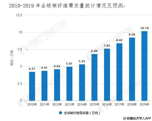 碳纤维应用领域广泛,因此需求量也比较大,据前瞻产业研究院发布的《中国碳纤维行业深度调研与投资战略规划分析报告》统计数据显示,2010年全球碳纤维需求量已达4.27万吨。并呈现逐年增长趋势。截止至2017年全球碳纤维需求量求增长至8.42万吨,初步测算2018年全球碳纤维需求量超9万吨,达到9.26万吨。预测2019年全球碳纤维需求量将突破10万吨。