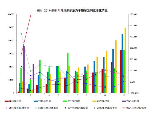 1-2月,新能源汽车产销分别完成31.7万辆和28.9万辆,同比分别增长3.9倍和3.2倍。分车型看,纯电动汽车产销分别完成27.3万辆和24.3万辆,同比分别增长4.6倍和3.6倍;插电式混合动力汽车产销分别完成4.4万辆和4.6万辆,同比分别增长1.7倍和1.8倍;燃料电池汽车产销分别完成59辆和91辆,同比分别下降59.3%和46.8%。